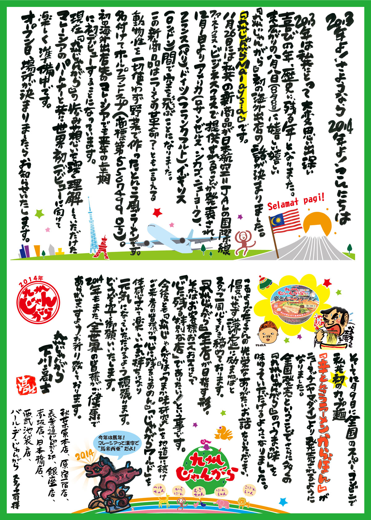 今後とも『九州じゃんがら』は「うまか味研究」を地道に続け ご来店の皆様が「心に残るらあめん」「じゃんがらワールド」を体感されて楽しい気持ちになり 元気になっていただけるよう頑張ります。
