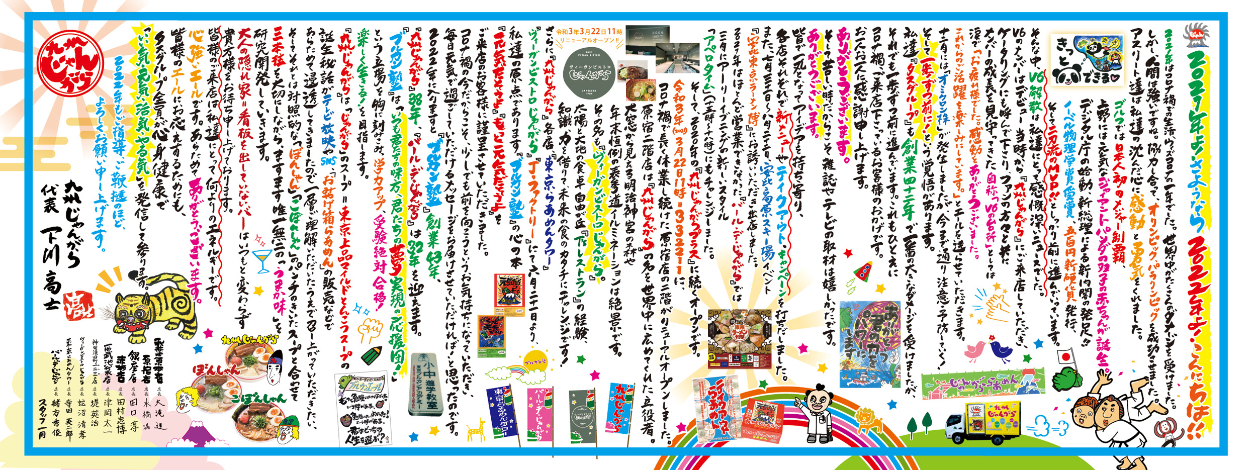『九州じゃんがら』は「じゃんがら」のスープ=東京上品マイルドとんこつスープの誕生秘話がテレビ放映やSNS、「おみやげ箱らあめん」の販売などであらためて浸透してきましたので一層ご理解いただいたうえで召し上がっていただきたい、そしてそれとは対照的な「ぼんしゃん」「こぼんしゃん」のパンチのきいたスープを合わせて三本柱を大切にしながら、ますます唯一無二の「うまか味」を研究開発していきます。